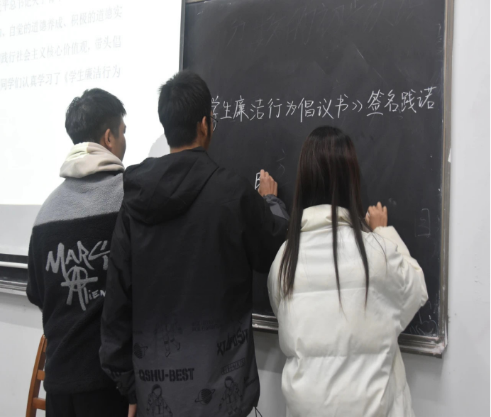 最后,大家认真学习了学院党委《学生廉洁行为倡议书》并签名承诺:不妄议中央大政方针;不信谣不造谣不传谣;不参加非法组织活动;不拉帮结派网络“翻墙”;不请客送礼贿赂老师;不考试舞弊弄虚作假;不传播参与黄黑毒赌;不传播参与传销诈骗;不攀比消费铺张浪费;不徇私情不谋求私利。