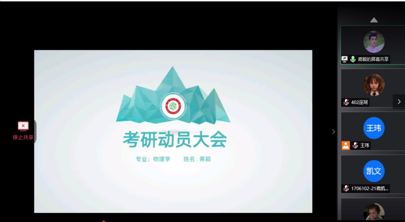 为提高学生考研积极性,帮助学生进一步掌握考研技巧,2020年6月4日下午4:00,388vip太阳集团官网通过腾讯会议平台召开了17级学生考研动员大会。学院党委书记余洪,副书记吴湘华、廖铁,17级辅导员郭昊晴出席会议,17级全体意向考研学生参加本次动员会。王玮老师担任会议主持人。