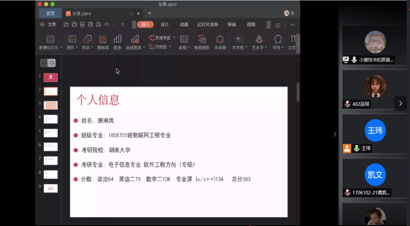 随后,已被中南大学拟录取的1612101班蒋毅以及被湖南大学拟录取的1606701班唐琳岚向同学们分享了考研经验与心得:一是目标院校的选择,可根据自身兴趣,老师、学长学姐推荐来敲定;二是合理的时间规划,将复习时间划分阶段,按时按质完成阶段任务;三是考试科目的书籍选择,分别就数学英语政治分享了实用的公众号、学习软件等;四是要保持良好心态,不轻言放弃,与志同道合的研友一起相互监督,共同进步。