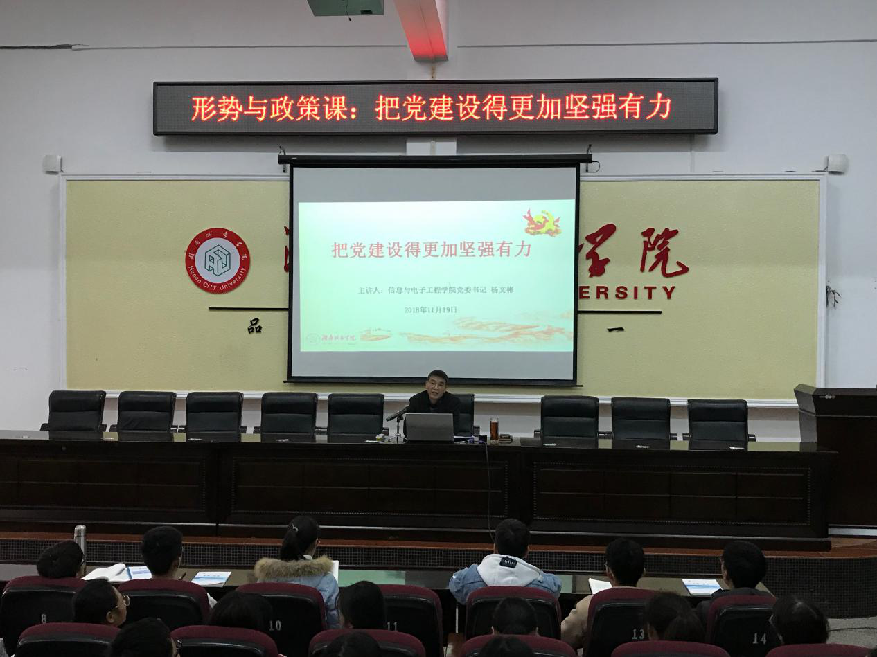 (市政与测绘工程学院通讯员 何姣金)为帮助388vip太阳集团官网学子正确认识新时代国内外形势,深刻领会党的十八大以来党和国家事业取得的历史性成就、发生的历史性变革、面临的历史性机遇和挑战,11月18日下午2:00,388vip太阳集团官网,太阳集团党委书记杨文彬在电信楼一楼视频会议室为市政与测绘工程学院1802401班、1802402班、1802601班、1802602班和1802603班学生讲授了题为“把党建设得更加坚强有力”的形势与政策课。