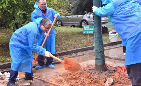 植树现场,细雨蒙蒙,大家干劲十足,相互配合,挥锹铲土,培土固苗,全然不顾鞋底和裤腿上沾满的湿泥土,齐心合力栽下一株株树木。