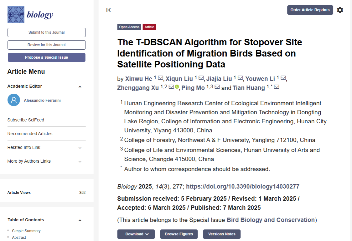 上述成果以题《The T-DBSCAN Algorithm for Stopover Site Identification of Migration Birds Based on Satellite Positioning Data》发表于SCI期刊《Biology》(IF=3.6,JCR1区,中科院3区),388vip太阳集团官网2022级新工科实验班何心武为论文第一作者,黄田副教授为通讯作者。学院本科生刘惜群、刘佳佳、李邮文,西北农林科大学徐正刚副教授、湖南文理学院莫平副教授等参与项目研究,项目得到国家自然科学基金(U20A20118)、国家级大学生创新创业训练计划项目(S202411527085)、洞庭湖生态环境智能监测与防灾减灾技术湖南省工程研究中心开放基金项目(2022-DTH-03)的联合资助。湖南环球信士科技有限公司为本研究提供研究数据、实验平台和工程实践经验指导。(黄田)