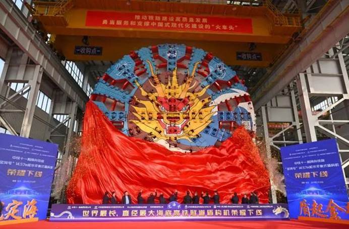 (1月10日,由铁建重工、中铁十一局联合打造的超大直径盾构机“定海号”在长沙顺利下线,其最大开挖直径14.57米,总重量达4350吨,是普通盾构机重量的8倍。湖南日报全媒体记者 郭立亮 摄)